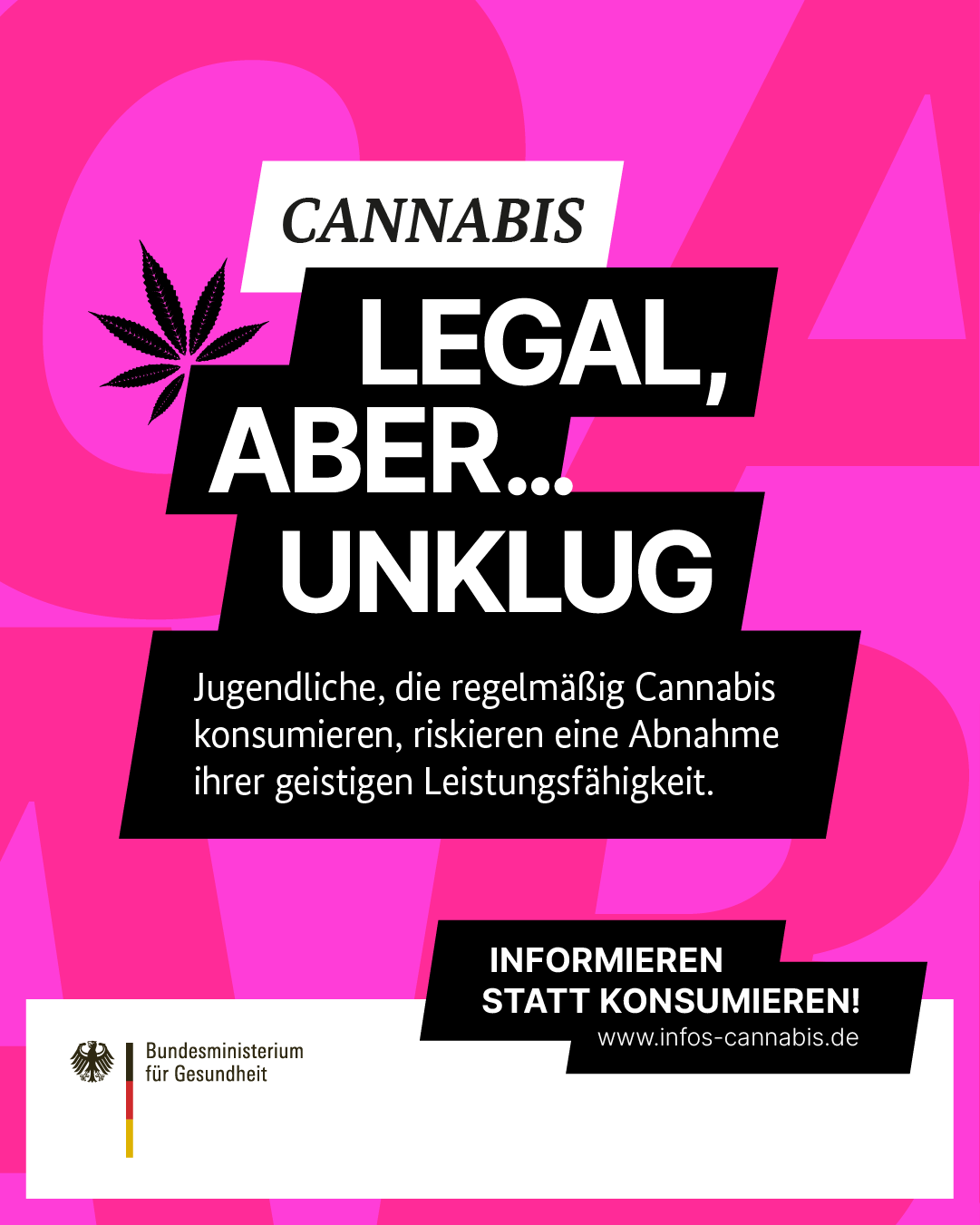 Die Bundesregierung hat die Legalisierung des Konsums von nichtmedizinischem Cannabis auf den Weg gebracht. Cannabis ist seit dem 1. April 2024 legal, aber … die gesundheitlichen und sozialen Risiken des Konsums bleiben. Das Bundesministerium für Gesundheit hat daher eine Aufklärungskampagne initiiert mit dem Ziel, durch Aufklärung und Informationen Jugendschutz und Prävention zu stärken und über den verbesserten Gesundheitsschutz durch die im Gesetz verankerten Maßnahmen zu informieren.