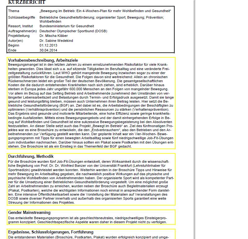 Ein Vier-Wochen-Bewegungsprogramm für mehr Wohlbefinden und Gesundheit am Arbeitsplatz bietet die durch das Bundesministerium für Gesundheit unterstützte Broschüre „Bewegt im Betrieb“ des Deutschen Olympischen Sportbund.