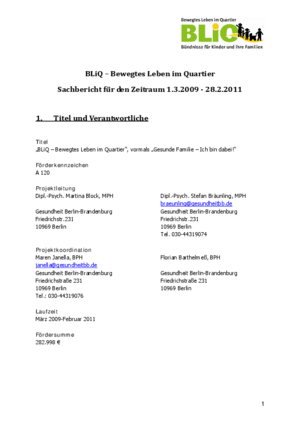 Genau hier setzt „BLiQ – Bewegtes Leben im Quartier“ an, das im Rahmen des Nationalen Aktionsplans "IN FORM – Deutschlands Initiative für gesunde Ernährung und mehr Bewegung" vom Bundesministerium für Gesundheit gefördert wurde. Zentrales Ziel war es, bestehende und bewährte Angebote zu nutzen und neue Möglichkeiten aufzuzeigen, um Angebotslücken zu schließen. Wesentlich für das Gelingen war die Einbeziehung der Familien in die Planung und Durchführung von einfachen und kostengünstigen Spielen zur aktiven Freizeitgestaltung. Dadurch konnte die Akzeptanz erhöht und bewegungsförderliche Verhaltensweisen dauerhaft eingeübt und verankert werden. Durch die Beteiligung kommunaler Akteure und dem Aufbau entsprechender Kommunikationsstrukturen ist der Fortbestand über die Projektdauer hinaus gesichert.