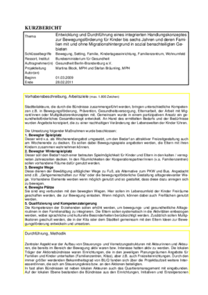 Genau hier setzt „BLiQ – Bewegtes Leben im Quartier“ an, das im Rahmen des Nationalen Aktionsplans "IN FORM – Deutschlands Initiative für gesunde Ernährung und mehr Bewegung" vom Bundesministerium für Gesundheit gefördert wurde. Zentrales Ziel war es, bestehende und bewährte Angebote zu nutzen und neue Möglichkeiten aufzuzeigen, um Angebotslücken zu schließen. Wesentlich für das Gelingen war die Einbeziehung der Familien in die Planung und Durchführung von einfachen und kostengünstigen Spielen zur aktiven Freizeitgestaltung. Dadurch konnte die Akzeptanz erhöht und bewegungsförderliche Verhaltensweisen dauerhaft eingeübt und verankert werden. Durch die Beteiligung kommunaler Akteure und dem Aufbau entsprechender Kommunikationsstrukturen ist der Fortbestand über die Projektdauer hinaus gesichert.