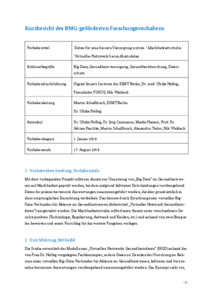 Das Projekt prüft einen Ansatz zur Umsetzung von „Big Data“ im Gesundheitswesen auf Machbarkeit, bei dem aufgrund fallweiser Entscheidungen vorübergehend Daten für präzise bestimmte Auswertungen zusammengeführt werden, die aber grundsätzlich in ihrer ursprünglichen Einrichtung verbleiben. Dazu wird das Modell eines virtuellen Big Data-Verbundes für Akteure im Gesundheitswesen entwickelt. Die Machbarkeitsstudie bewertet diesen Ansatz unter verschiedenen Gesichtspunkten, wie Technologie, Regulierung, Aufwand und Risiken, etc. und anhand von zwei Anwendungsszenarien.