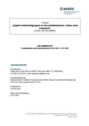 „Digitale Selbsthilfegruppen im Gesundheitsbereich. Aufbau einer Datenbank“ durchgeführt von der Nationalen Kontakt- und Informationsstelle zur Anregung und Unterstützung von Selbsthilfegruppen (NAKOS)