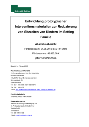 Sitzendes Verhalten rückt als eigenständiges Thema neben der Bewegungsförderung zunehmend in das gesundheitswissenschaftliche und gesellschaftliche Interesse. Diverse Forschungsergebnisse zeigen sogar einen gesundheitsriskanten Einfluss langer Sitzzeiten. Insbesondere zur Vorbeugung von Übergewicht bietet jede weniger verbrachte Minute im Sitzen einen Zusatznutzen. Studien zeigen zudem auf, dass lange Sitzzeiten während der Kindheit das Risiko erhöhen, auch als Erwachsener übergewichtig zu sein und zu werden. Ziel des Projektes war die Entwicklung, Erprobung und Optimierung prototypischer Interventionsmaterialien zur Reduzierung von übermäßigem Sitzen bei Kindern im familiären Setting.