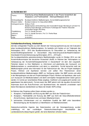Im Rahmen des Aktionsplans 2013-2015 war u. a. die Einführung eines patientenbezogenen, bundeseinheitlichen Medikationsplans als Instrument zur Risikoreduktion in der Arzneimittelversorgung sowie die Förderung von drei Modellprojekten zur Erprobung von Akzeptanz und Praktikabilität in der Praxis vorgesehen. Dazu wurden vom Bundesministerium für Gesundheit nach wissenschaftlicher Begutachtung drei Forschungsprojekte ausgewählt und finanziell gefördert. Die Projekte wurden von der Bundesvereinigung Deutscher Apothekerverbände (ABDA) dem Klinikum Fürth und der Universität Witten-Herdecke (Modellregion Erfurt) vom 1. Oktober 2014 bis zum 31. März 2017 durchgeführt. Die folgenden Abschluss- und Kurzberichte stellen die Ergebnisse dieser Untersuchungen vor.