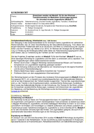 Für chronisch kranke Jugendliche ist der Übergang in das Erwachsenenalter mit besonderen Herausforderungen verbunden, meist auch mit einem Wechsel in der medizinischen Betreuung. Mit diesem Projekt wurde ein spezieller krankheitsübergreifender Schulungsworkshop erfolgreich entwickelt und erprobt, der chronisch kranken Jugendlichen und jungen Erwachsenen beim Übergang von der Kinder- und Jugendmedizin in die Erwachsenenmedizin hilft.
