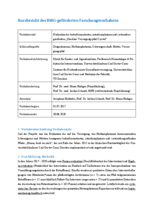 Die TU Dresden hat mit dem „Dresdner Versorgungspfad Crystal“ eine interdisziplinäre Versorgungsstruktur in der Praxis evaluiert, die sich an methamphetamingebrauchende Mütter und Schwangere wendet. Mit diesem Projekt wurde zudem ein Implementierungshandbuch entwickelt, dass die Umsetzung auch in anderen Regionen und für Konsumentinnen anderer Substanzen ermöglichen soll.