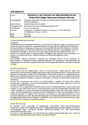 Die geburtshilfliche Versorgung durch Hebammen, vor allem die durch freiberuflich tätige, ist in den letzten Jahren immer mehr in den Fokus politischer und gesellschaftlicher Diskussionen gerückt. Angeregt durch die Ergebnisse der interministeriellen Arbeitsgruppe „Versorgung mit Hebammenhilfe“ hat das BMG ein Gutachten zu Ursachen von Geburtsschäden bei von freiberuflich tätigen Hebammen betreuten Geburten in Auftrag gegeben. Ziel war es, die tatsächliche Datenlage zu untersuchen und aus der Analyse Erkenntnisse über Schadensursachen sowie Ansätze für die Verbesserung der Versorgung abzuleiten. Die Ergebnisse des Gutachtens sollen nutzbringend in die Prozesse zur Qualitätssicherung bzw. Fehlervermeidung in der Geburtshilfe eingebracht werden.