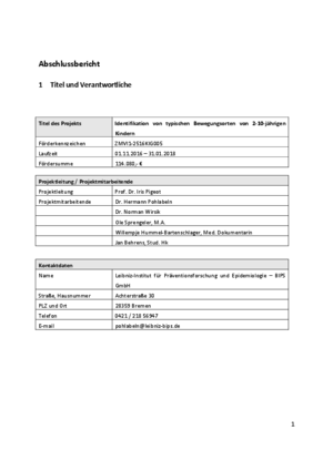 Das Vorhaben sollte typische Bewegungsorte von 2-10 jährigen Kindern identifizieren, in denen sie besonders intensiv und lange körperlich aktiv sind. Diese Erkenntnisse sollten dann bei Akteurinnen und Akteuren sowie Multiplikatorinnen und Multiplikatoren bekannt gemacht werden, damit sie in wirksame und qualitätsgesicherte Maßnahmen zur Prävention einfließen. Basis der Untersuchung bildeten Daten, die im Rahmen der IDEFICS-Studie (Identification and prevention of Dietary- and lifestyle-induced health EFfects In Children and infantS) in acht europäischen Ländern erhoben wurden.