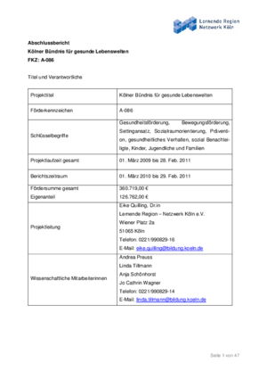 Das "Kölner Bündnis für gesunde Lebenswelten" verfolgte das Ziel insbesondere Kinder und Jugendliche aus sozial schwierigen Verhältnissen zu einem aktiven Lebensstil zu motivieren. Hierzu wurden bewegungsfördernde Maßnahmen in Kindertagesstätten und Hauptschulen ausgebaut, Gesundheitsteams (bestehend aus Lehrkräften, Schülern/innen und ggf. aus Eltern) geschult, Erzieherinnen und Erzieher qualifiziert sowie ein Gütesiegel "Gesunde Schule Köln" entwickelt und verliehen. Aber auch für die Transparenz der Angebote hat das Bündnis gesorgt. So entstand ein "Online-Atlas Gesundheitsfördernde Angebote in Köln" mit dem passende gesundheitsfördernde Programme aus den Bereichen Bewegung, Ernährung und Stressregulation zu finden sind.