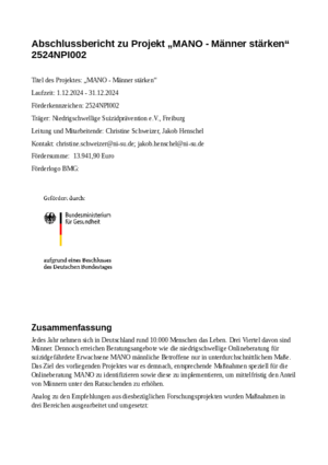 Die Bundesregierung hat Ende April 2024 unter Federführung des BMG eine nationale Suizidpräventionsstrategie veröffentlicht. In einem Umsetzungspapier wird die Konzentration auf Hochrisikogruppen empfohlen. Awareness-, Aufklärung- und Entstigmatisierungskampagnen sollen insbesondere Männer und alte Menschen als Hochrisikogruppe adressieren. Darauf zielte das vorliegende Projekt ab. Über unterschiedliche Kommunikationswege wurden gezielt Männer auf das Hilfsangebot aufmerksam gemacht und in die Beratung einbezogen.