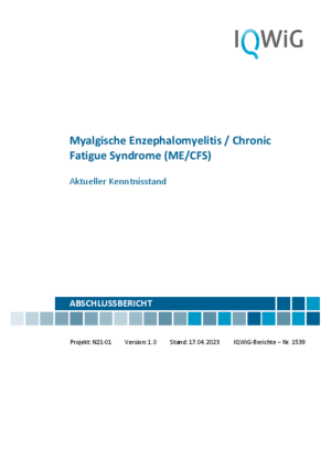 Um die wissenschaftlichen Erkenntnisse zum Krankheitsbild ME/CFS zusammenzutragen und zu bewerten, hat das Bundesministerium für Gesundheit (BMG) das Institut für Qualität und Wirtschaftlichkeit im Gesundheitswesen (IQWiG) damit beauftragt, den aktuellen Wissensstand in Form eines wissenschaftlichen Berichts aufzuarbeiten. Der IQWiG-Abschlussbericht enthält den aktuellen Wissensstand zu ME/CFS insbesondere zu Ätiologie, Symptomen, Risikofaktoren, Prävalenz, Verlauf der Erkrankung, Diagnose und Rehabilitation sowie eine Evidenzkartierung und Nutzungsbewertung relevanter Therapieoptionen.