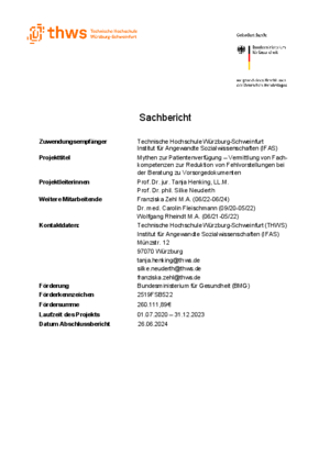 Das Projekt „Mythen zur Patientenverfügung – Vermittlung von Fachkompetenzen zur Reduktion von Fehlvorstellungen bei der Beratung zu Vorsorgedokumenten (MyPath)“ wurde durchgeführt vom Institut für Angewandte Sozialwissenschaften (IFAS) an der Technischen Hochschule Würzburg-Schweinfurt (THWS).