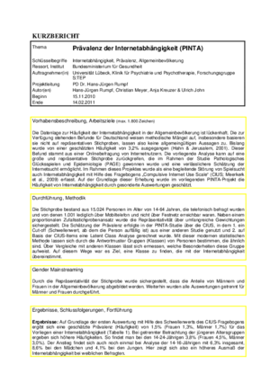 Die vom Bundesministerium für Gesundheit seit Ende 2010 geförderte repräsentative Studie „Prävalenz der Internetabhängigkeit (PINTA)“ der Universität Lübeck und der Universität Greifswald beziffert zum ersten Mal die Häufigkeit der Internetabhängigkeit in Deutschland. Etwa 1 % der 14- bis 64-Jährigen in Deutschland werden als internetabhängig eingestuft. 4,6 % der 14- bis 64-Jährigen werden als problematische Internetnutzer angesehen.
