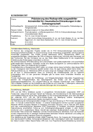 Im Rahmen des vorliegenden Projekts werden die im PVZ Embryonaltoxikologie dokumentierten Schwangerschaftsverlaufsdaten im Zusammenhang mit der Anwendung ausgewählter antirheumatischer Arzneimittel ausgewertet.