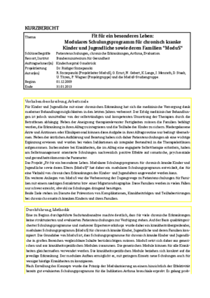 Das Projekt „Fit für ein besonderes Leben. Modulares Schulungsprogramm für chronisch kranke Kinder und Jugendliche sowie deren Eltern (ModuS)“ hat daher ein modulares Schulungsprogramm entwickelt, das für eine Vielzahl von chronischen Erkrankungen des Kindes- und Jugendalters angewendet werden kann. Ein weiteres Anliegen von ModuS war die Verbesserung der Zugangswege zu Patientenschulungen für Familien mit einem niedrigen Sozialstatus bzw. einer Migrationsbiographie. Diese Familien werden in vielen Fällen nur schwer erreicht, obwohl sie Schulungen dringend benötigen. Beide Ziele stehen im Dienste der Prävention von Komplikationen, Krankheitsfolgen und Teilhabestörungen bei chronisch somatisch kranken Kindern und ihren Familien.