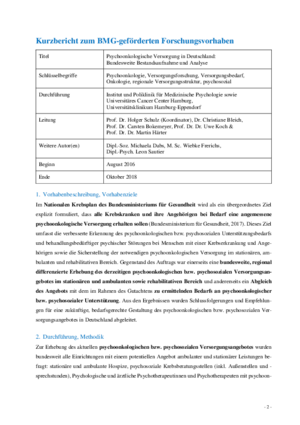 Mit dem vom BMG im Rahmen des Nationalen Krebsplans in der Zeit von 2016 bis 2018 geförderten Gutachten am Universitätsklinikum Hamburg-Eppendorf liegt nun eine flächendeckende Erhebung der psychoonkologischen und psychosozialen Angebote in Deutschland vor. Neben der Untersuchung der verschiedenen Versorgungsbereiche (ambulant, stationär und rehabilitativ) wurden die verfügbaren Angebote bundesweit und regional differenziert erfasst und bewertet. Die Ergebnisse umfassen auch Schlussfolgerungen und Empfehlungen für eine zukünftige Ausgestaltung des psychoonkologischen und psychosozialen Versorgungsangebotes in Deutschland.