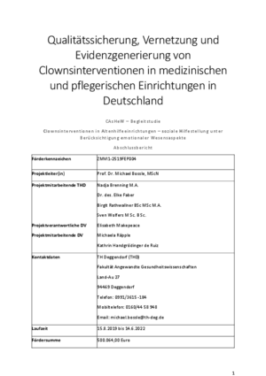 Die Autorinnen und Autoren dieser Studie liefern Antworten auf diese Fragen und formulieren praktische Handreichungen, die sowohl Senioreneinrichtungen beim Einsatz von Klinik Clowns unterstützen, als auch weitere interessierte Akteure wie z.B. Angehörige informieren können. Weitere Details zur Intervention, Methodik der Studie, beteiligten Akteuren sowie den Ergebnissen, finden sich in dem vorliegenden Abschlussbericht.