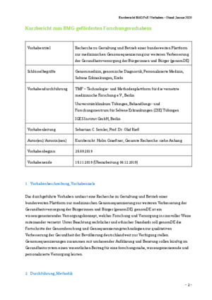 Bereits heute spielt die Untersuchung des menschlichen Genoms bei der Therapieauswahl in der Onkologie und bei der Diagnostik Seltener Erkrankungen eine maßgebliche Rolle. Auch auf anderen Therapiegebieten sind künftig spezifische Versorgungskonzepte im Sinne einer „Personalisierten Medizin“ ohne die Einbeziehung genetischer Information kaum denkbar. Damit zeichnen sich innovative Behandlungs-, Diagnose- und Präventionsansätze ab, die sich unter dem Begriff „Genommedizin“ zusammenfassen lassen. Das durchgeführte Vorhaben umfasst eine Recherche zu Gestaltung und Betrieb einer bundesweiten Plattform zur medizinischen Genomsequenzierung zur weiteren Verbesserung der Gesundheitsversorgung der Bürgerinnen und Bürger (genomDE). Sie beinhaltet die Aufarbeitung der aktuellen Literatur zur medizinischen Genomsequenzierung, zu laufenden Forschungsprojekten und Fördermaßnahmen sowie Experteninterviews.