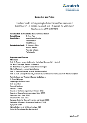 Aufgrund des Ausbruchs der COVID-19-Pandemie im Frühjahr 2020 mussten viele Bereiche des öffentlichen und privaten Lebens zeitweise eingeschränkt werden. Ziel des Projektes war es, das deutsche Gesundheitssystem angesichts der COVID-19-Pandemie zu analysieren, Erkenntnisse aus der Krise zu ziehen und daraus Maßnahmen zur Stärkung der Resilienz des Gesundheitssystems abzuleiten. Im Mittelpunkt der Analyse standen dabei die Bereiche: Information, Infrastruktur, strategische Reserven und Strukturreformen. Dem Projekt lag eine gesamtgesellschaftliche Betrachtungsweise zugrunde, durch welche die Komplexität und Vernetzung sowie die Notwendigkeit globaler Aspekte herausgearbeitet werden konnten.