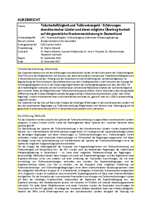 Das Gutachten erörtert ausführlich die in den skandinavischen Ländern bestehenden Regelungen zu Teilarbeitsfähigkeit und Teilkrankengeld. Es wird analysiert, ob und inwieweit einzelne Elemente der skandinavischen Systeme auf Deutschland übertragbar wären. Bei der Analyse spielen insbesondere die Faktoren eine Rolle, die die berufliche Wiedereingliederung langzeiterkrankter Beschäftigter unterstützen können. Hintergrund ist eine Empfehlung des Sachverständigenrats zur Begutachtung der Entwicklung im Gesundheitswesen (SVR Gesundheit). Dieser hatte in seinem im Dezember 2015 veröffentlichten Sondergutachten "Krankengeld – Entwicklung, Ursachen und Steuerungsmöglichkeiten“ (PDF-Link der Internetseite des SVR Gesundheit) vorgeschlagen, ein Teilkrankengeld nach skandinavischem Vorbild einzuführen.