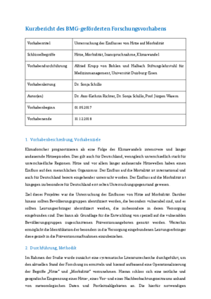 Das Vorhaben „Untersuchung des Einflusses von Hitze auf Morbidität“ wurde von der Universität Duisburg-Essen im Zeitraum vom 01.05.2017 bis zum 31.12.2018 durchgeführt. Es wurde eine signifikant erhöhte Inanspruchnahme der medizinischen Stellen wie z.B. Krankenhausaufnahmen, ambulante Arztkontakte, im Hitzezeitraum dokumentiert. Zudem zeigte sich, dass Versicherte mit Pflegestufe eindeutig zu den vulnerablen Bevölkerungsgruppen einer Hitzewelle gehören und eine gesteigerte Morbidität aufweisen. Damit ergeben sich erste Hinweise, wo Präventionsmaßnahmen, z.B. im Rahmen von Hitzeaktionsplänen, besonders wirkungsvoll eingesetzt werden können. Die Projektergebnisse stellen daher einen Beitrag des BMG zur Weiterentwicklung der Anpassungsbemühungen im Rahmen der Deutschen Anpassungsstrategie an den Klimawandel (DAS) dar.