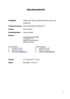 Im Rahmen des Ressortforschungsschwerpunktes „Strategie der Bundesregierung zur Förderung der Kindergesundheit“ wurde durch das Umweltbundesamt das Projekt „Wissen über Wasser und Gesundheit für Kinder und Jugendliche“ durchgeführt. Ziel war es, durch die Vermittlung von Verhaltensregeln, mit denen Expositionen gegenüber Krankheitserregern und Schadstoffen aus Trink- und Badewasser minimiert und Unfallgefahren im und am Wasser vermieden werden können. Für die Vermittlung der inhaltlichen Ziele wurde die Form eines bebilderten Kinderbuches und eines interaktiven Wissensquiz als Computeranimation (Lernspiel) gewählt. Mit dem Kinderbuch werden Kinder im Alter zwischen acht bis zwölf Jahren und mit dem Wissensquiz Kinder und Jugendliche ab zwölf Jahren angesprochen.