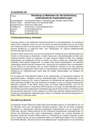 Ein systematisches und transparentes Vorgehen bei der Entwicklung von Impfempfehlungen erhöht die Qualität und Glaubwürdigkeit der Empfehlungen. Mit zwei internationalen Workshops im November 2010 und im November 2011 zu evidenzbasierten Impfempfehlungen wurden die Grundsteine für eine entsprechende Aktualisierung der Methodik der Ständigen Impfkommission (STIKO) beim Robert Koch-Institut gelegt. Die STIKO wendet seit Anfang 2012 für die Erstellung der Empfehlungen für Schutzimpfungen den Ansatz der „Grading of Recommendations Assessment, Development and Evaluation“ (kurz GRADE) Working Group auf der Grundlage systematischer Übersichtsarbeiten im Sinne der Evidenzbasierten Medizin (EbM) an.